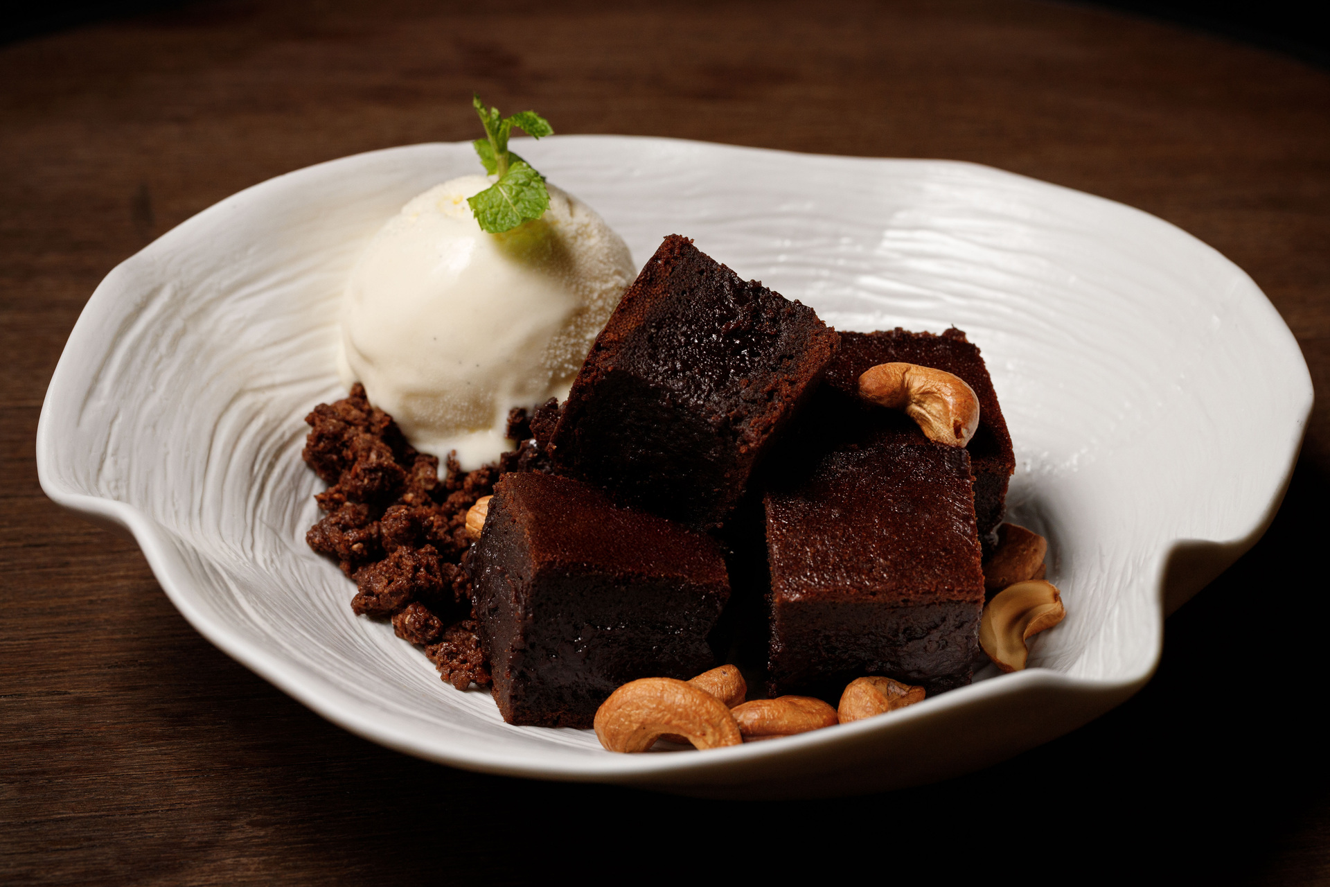 以嚴選苦甜巧克力與奶油烘焙而成,入口濃郁紮實。再以辣椒、薑母與肉桂粉添上微辣暖香,平衡甜膩。搭配清爽柔和的香草冰淇淋,尾韻堆疊出驚喜。