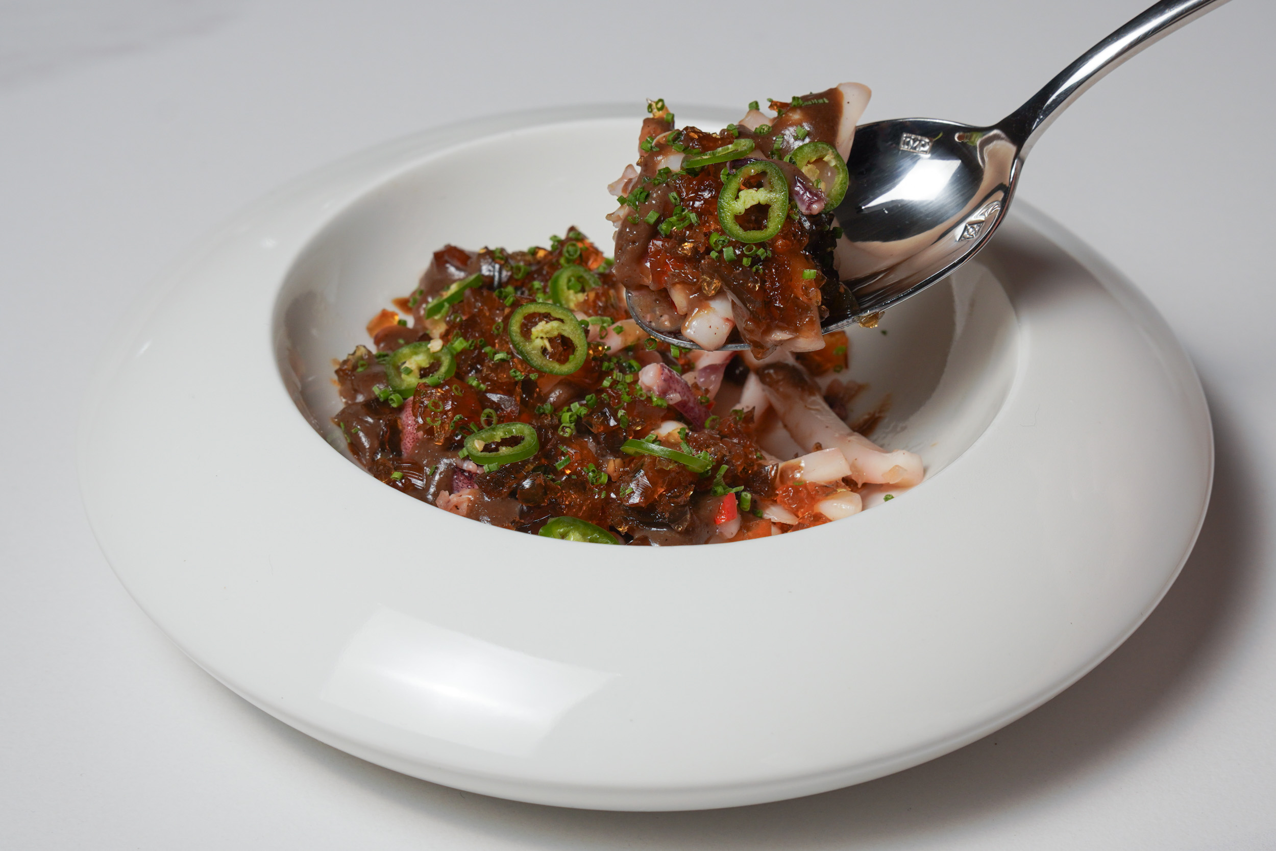 rén Bistronomy 的菜色擅長臺味食材搭配歐法料理技法,走分食友善、下酒取向,例如自開幕即受歡迎的皮蛋中卷(微辣),在風味與口感層次上很能帶起第一輪酒;也有把街頭靈感搬上桌的夜市烤玉米 Pizza、以在地滋味翻玩的披薩與小點。
