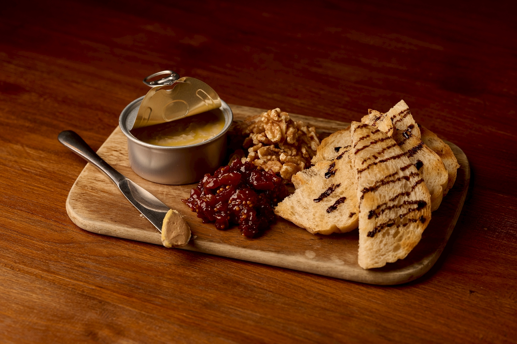 雞肝先以牛奶浸泡一晚,再以高溫煎烤表面,混合新鮮蔥蒜及法國進口紅辣椒製成,搭配烤麵包片、波特酒芥末果粒醬、堅果。